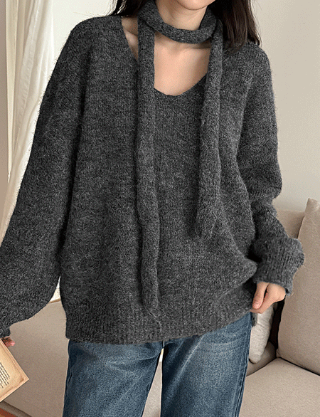 헤어리 羊駝毛 羊毛 V領 針織 圍巾 套裝 84226