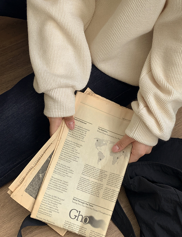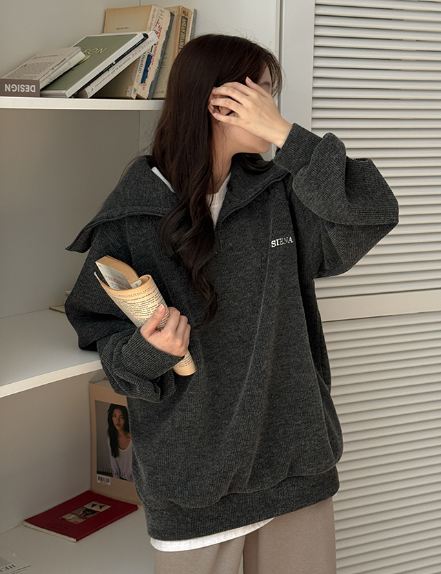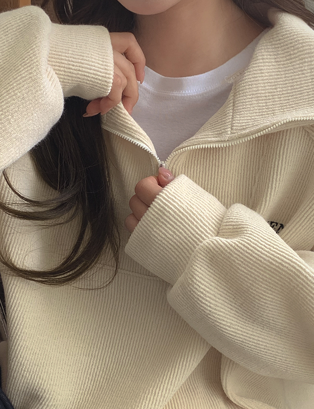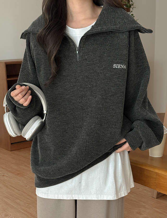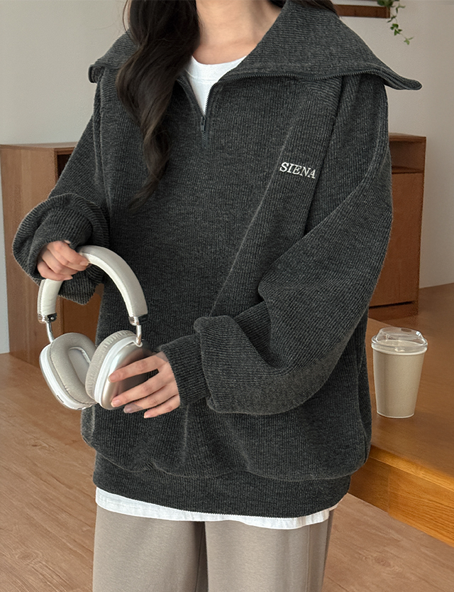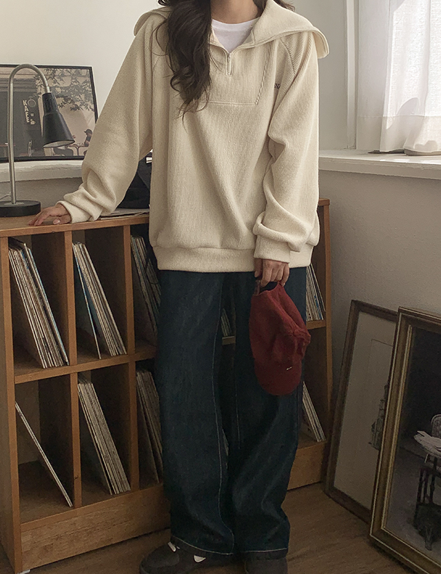 니트 텍스쳐에 반집업 디테일이 매력적인 루즈핏 자수 맨투맨