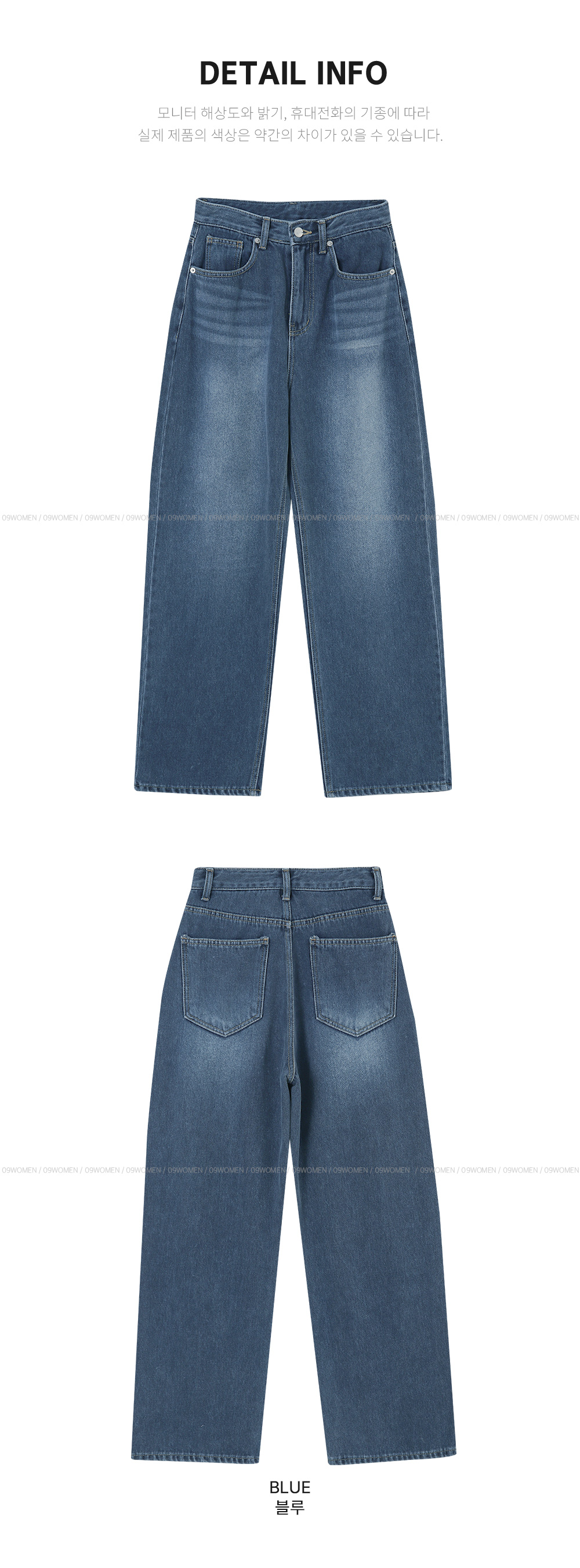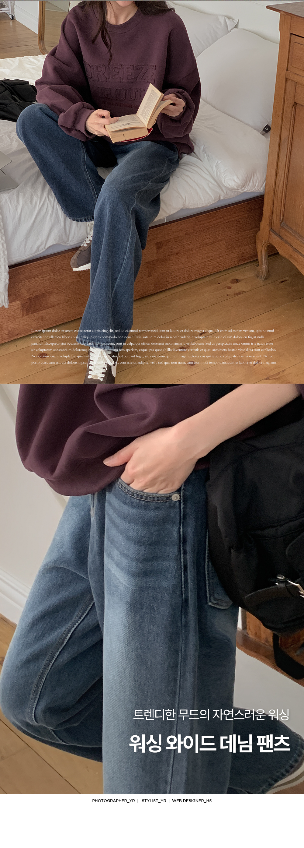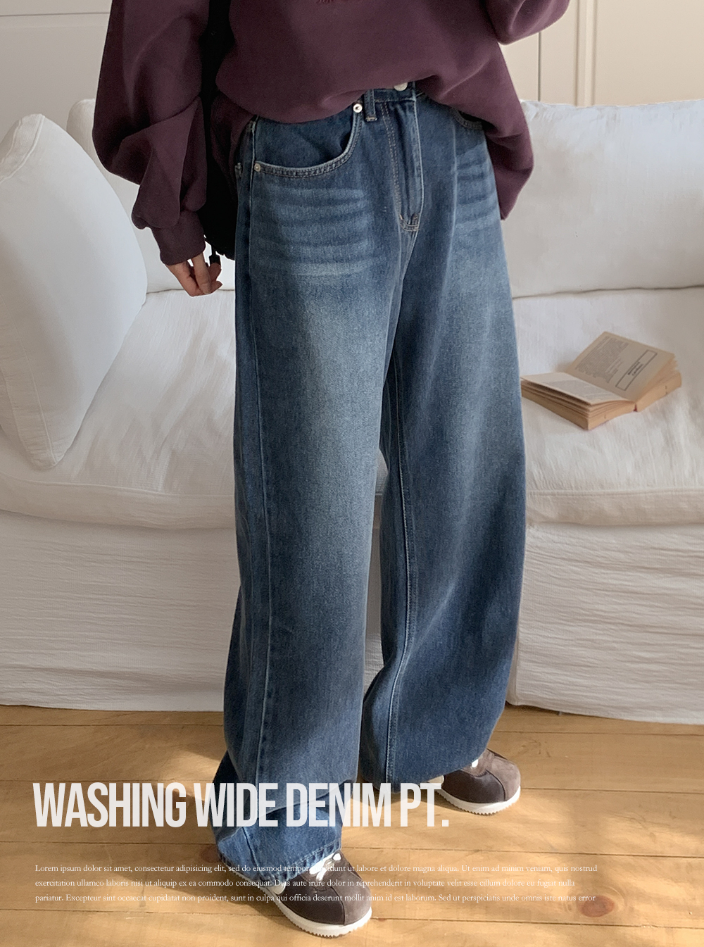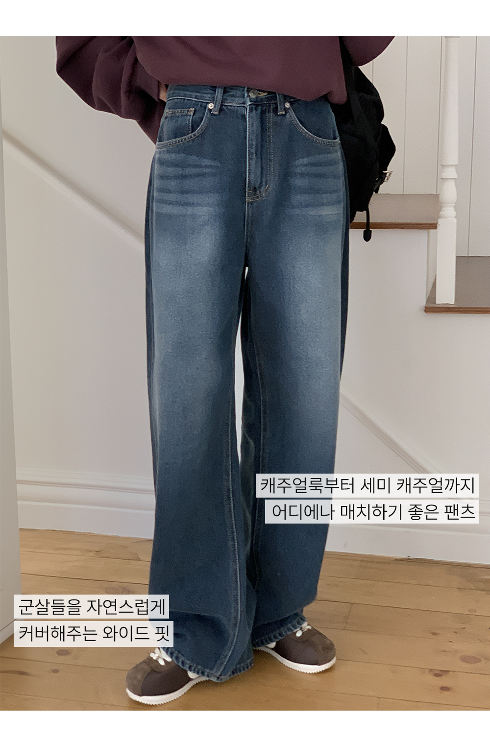 자연스러운 워싱으로 트렌디한 무드를 살린 와이드 데님 팬츠