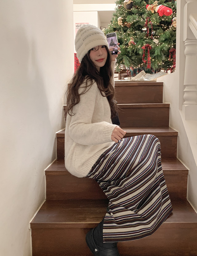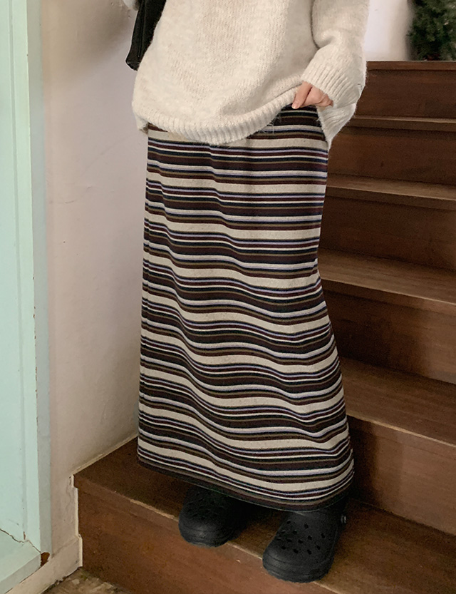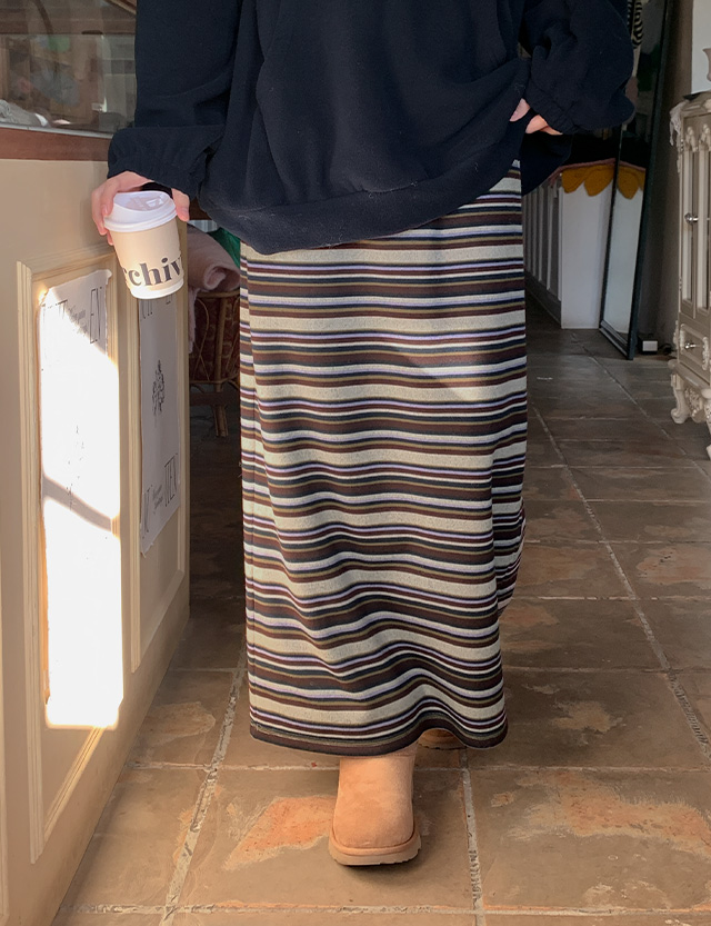 卡布基諾 條紋 絨毛 加絨 맥시 鬆緊腰 裙 85465