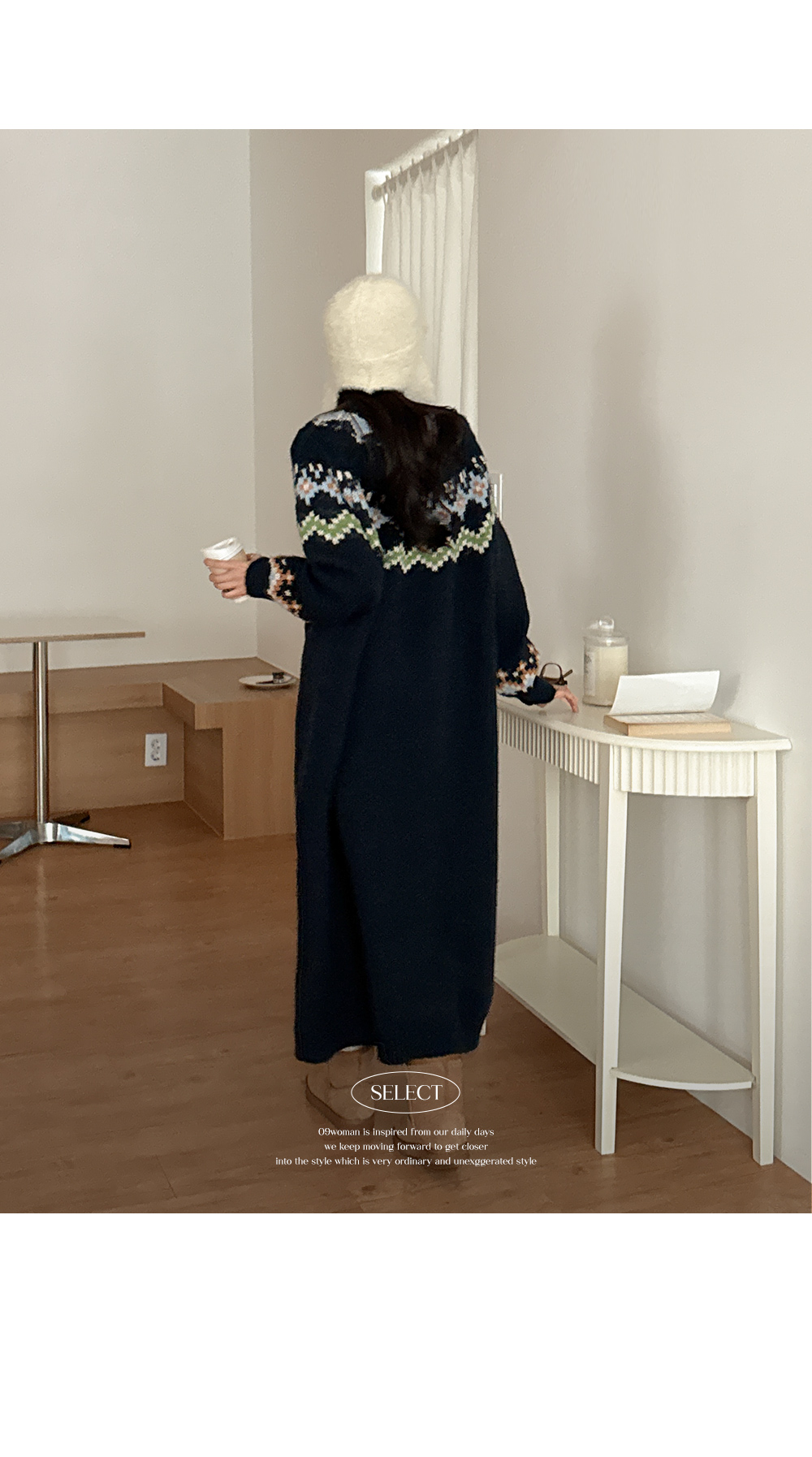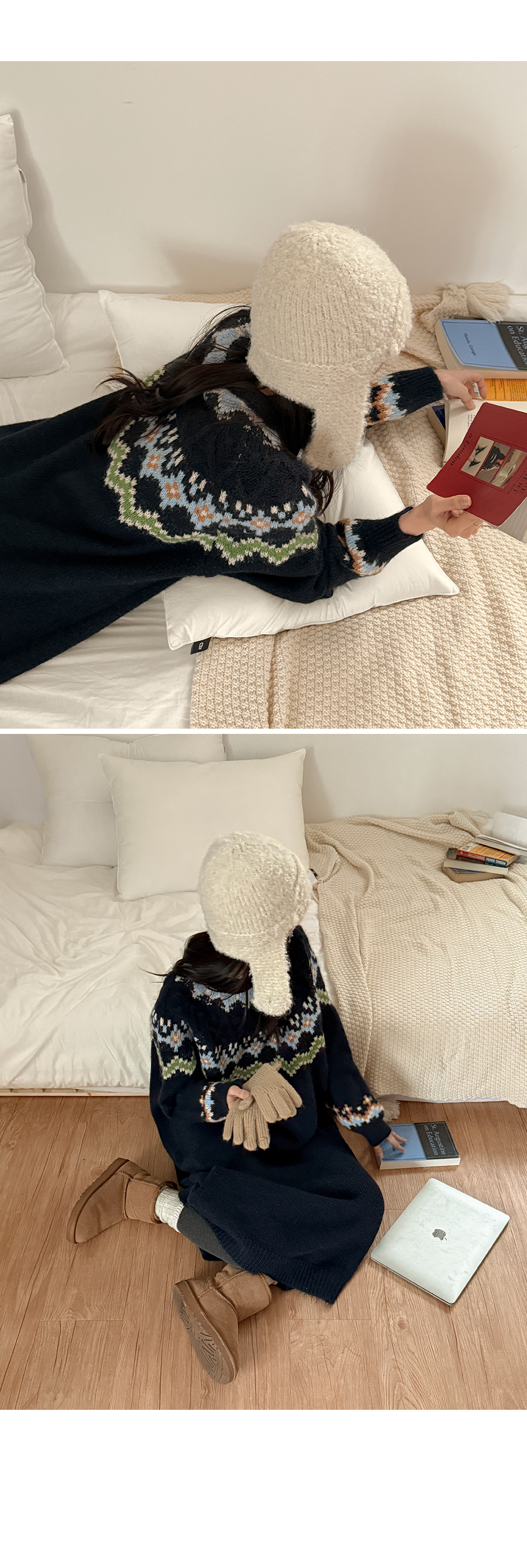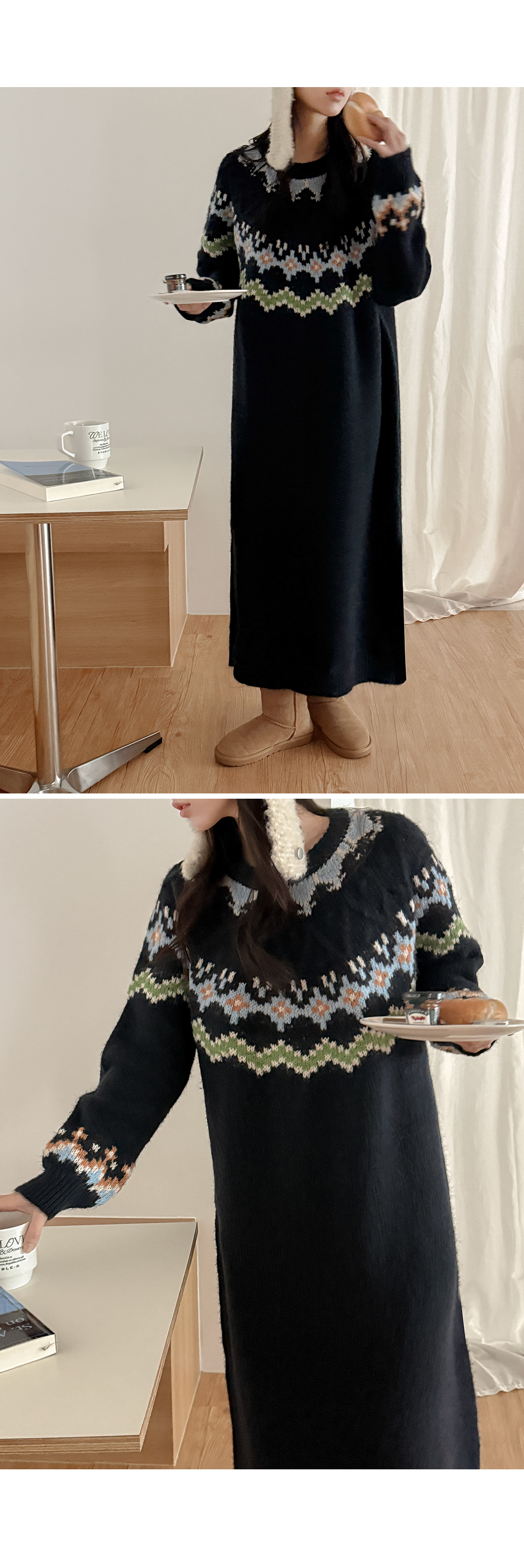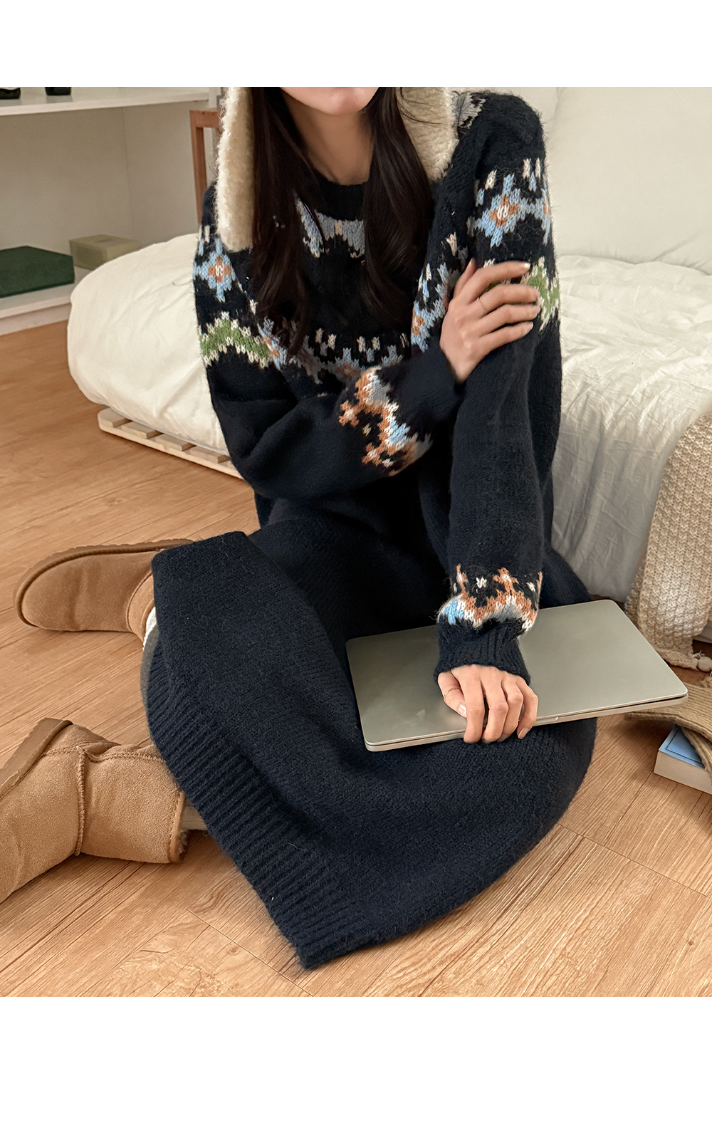 두엔 圓領 北歐 圖案 針織 長款 洋裝 85717