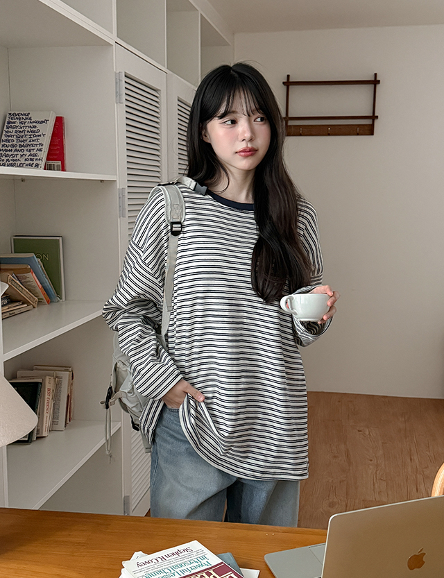 루앙 條紋 配色 圓領 長袖 T恤 86025