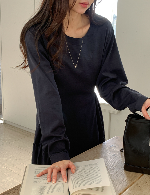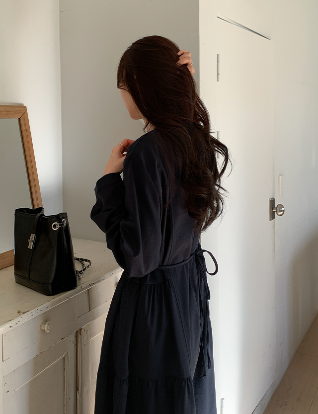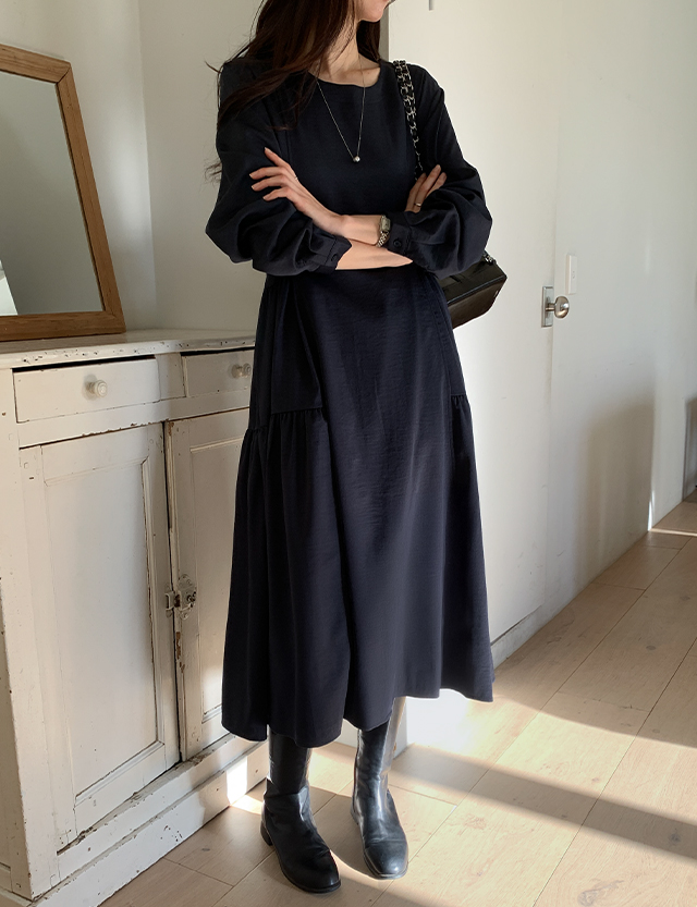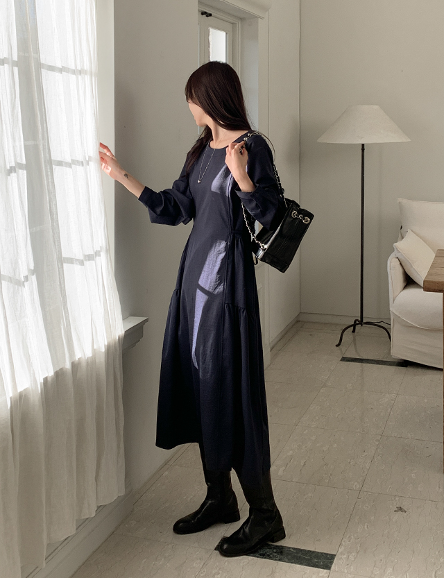 미로아 圓領 皺摺 長款 洋裝 86065