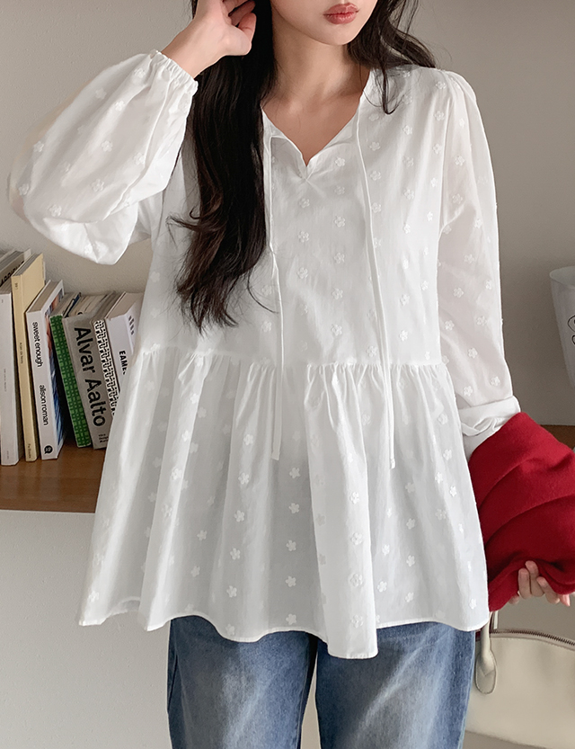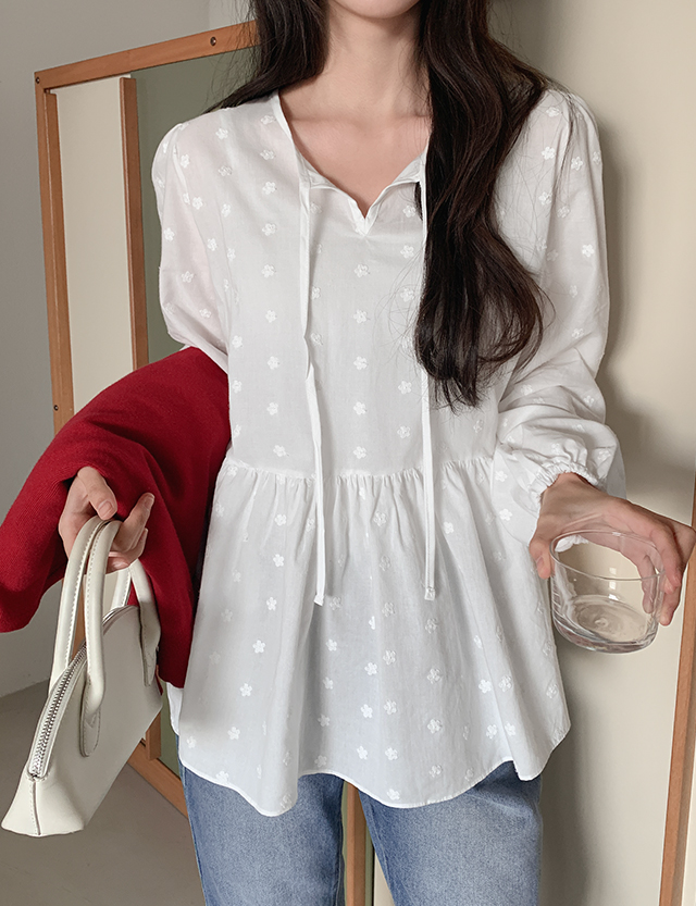 - 밴딩이 더해진 퍼프소매로 여성스러운 무드를 더욱 up