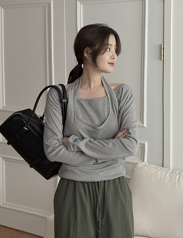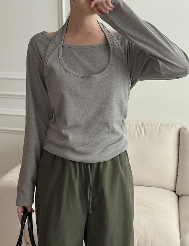 - 홀터 + 긴팔 레이어드 디자인으로 유니크하고 편안한 티셔츠