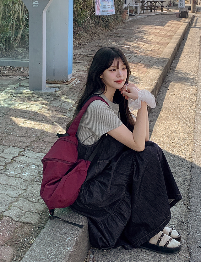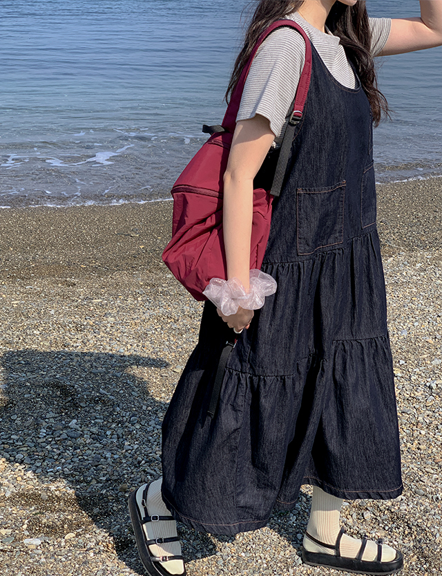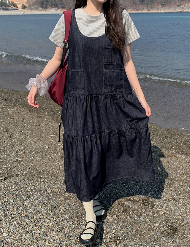 귀여운 캉캉 디자인을 더한 데님 원피스예요.