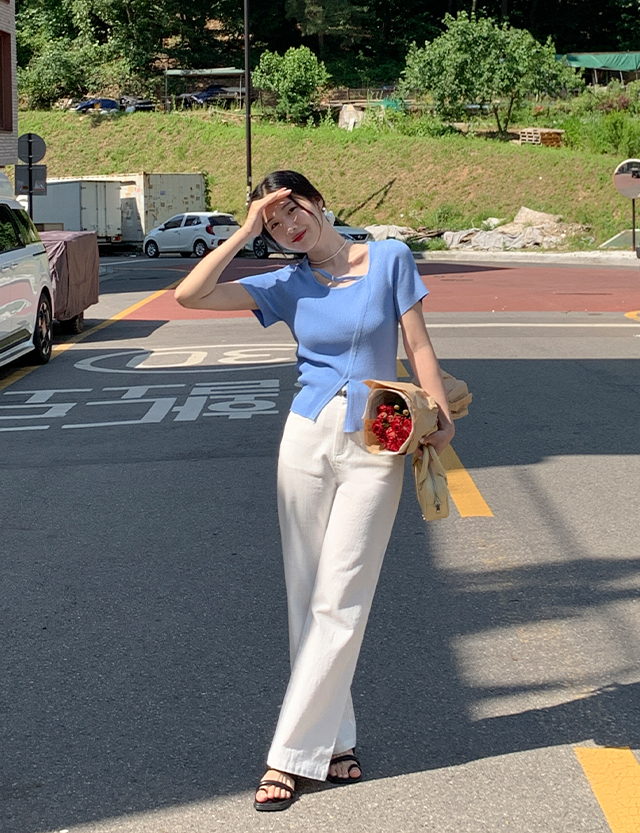 方領荷葉邊短袖襯衫 76010