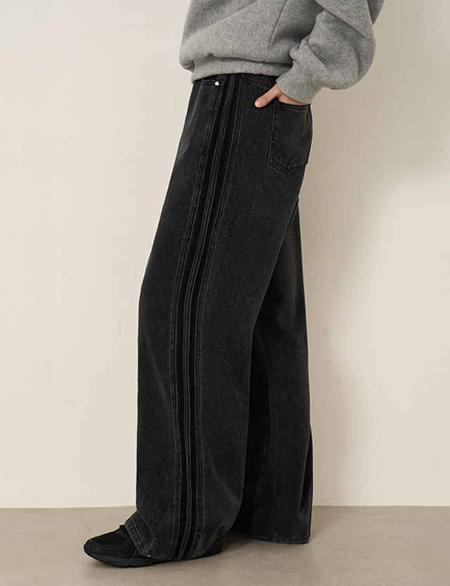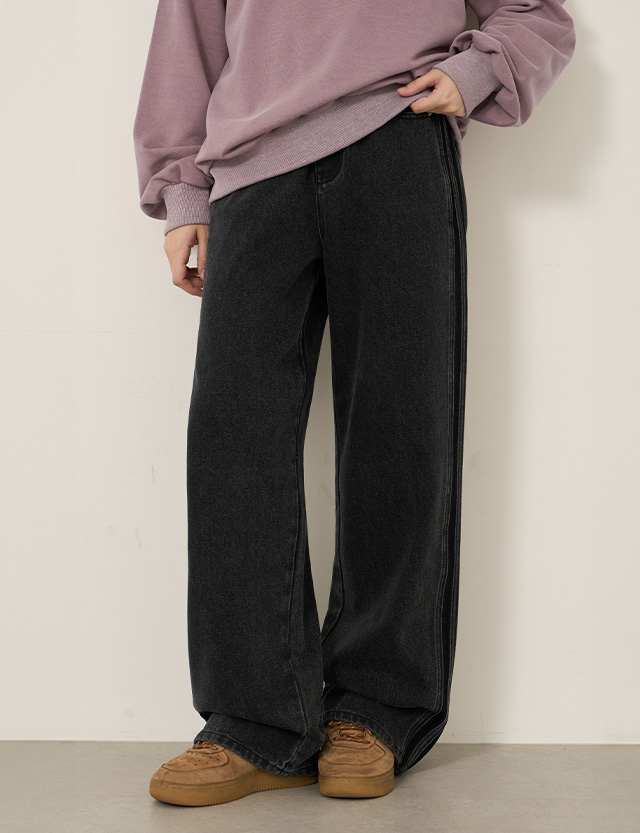 키샤 鬆緊腰 흑청 寬 트랙 牛仔 褲 84373