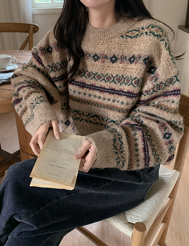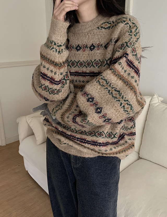 페어 碎花 아일 圓領 寬鬆 羊毛 針織 85288