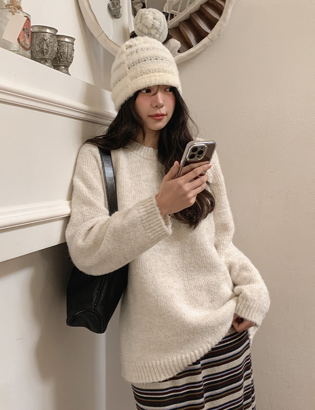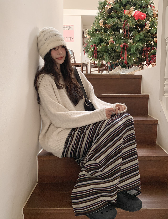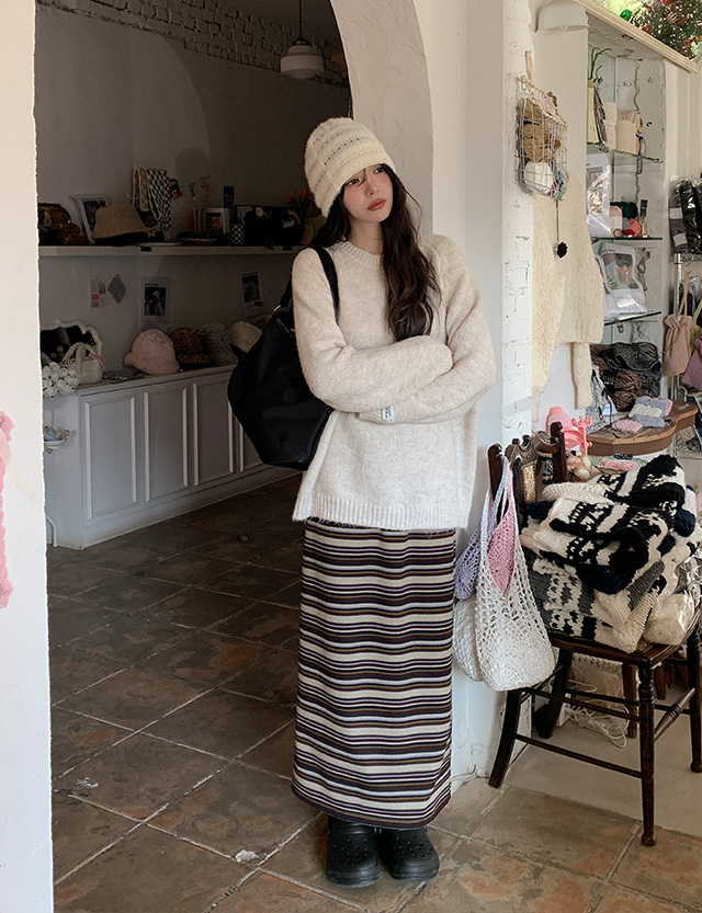 卡布基諾 條紋 絨毛 加絨 맥시 鬆緊腰 裙 85465