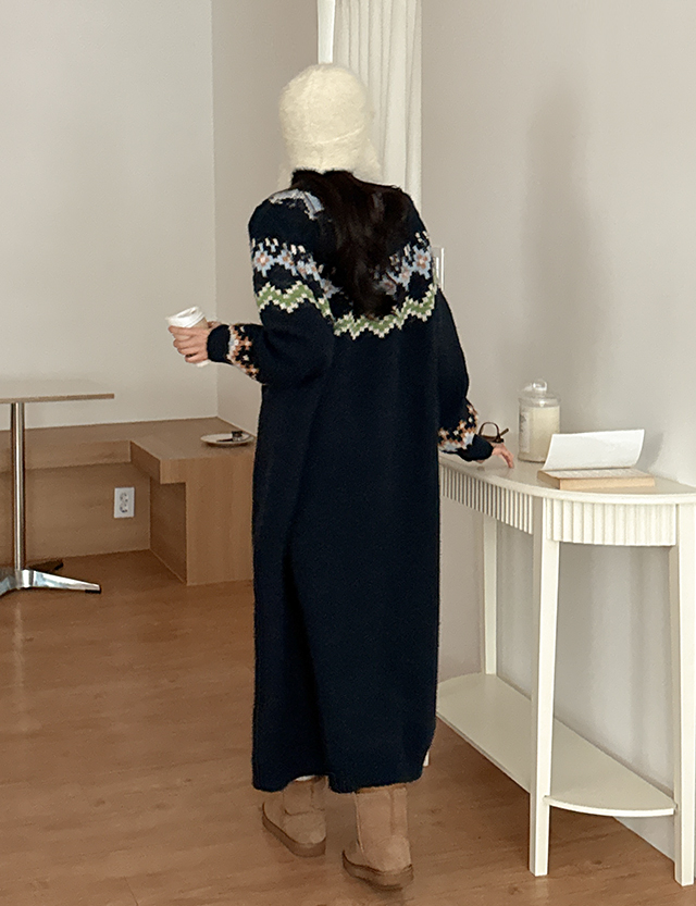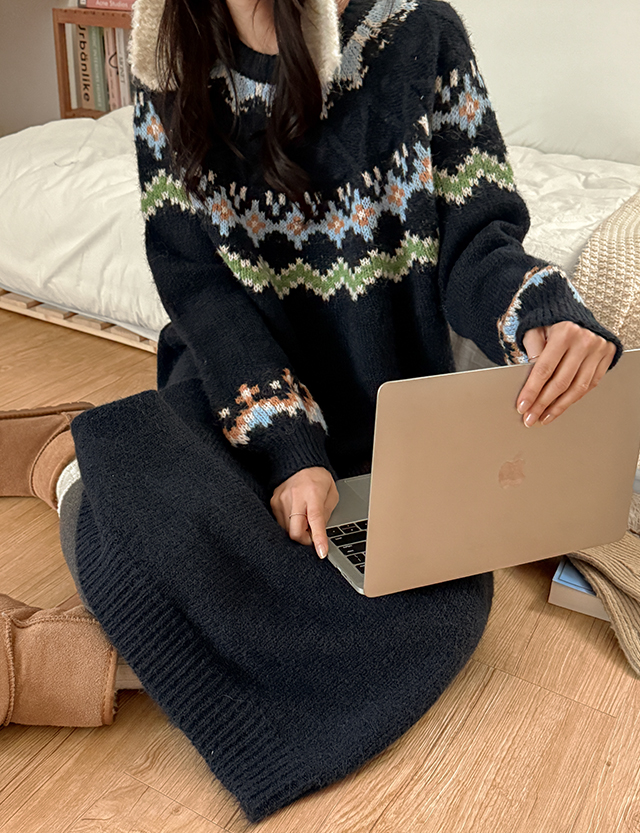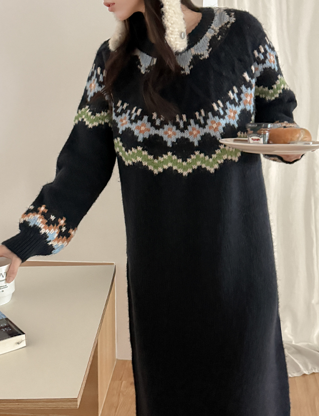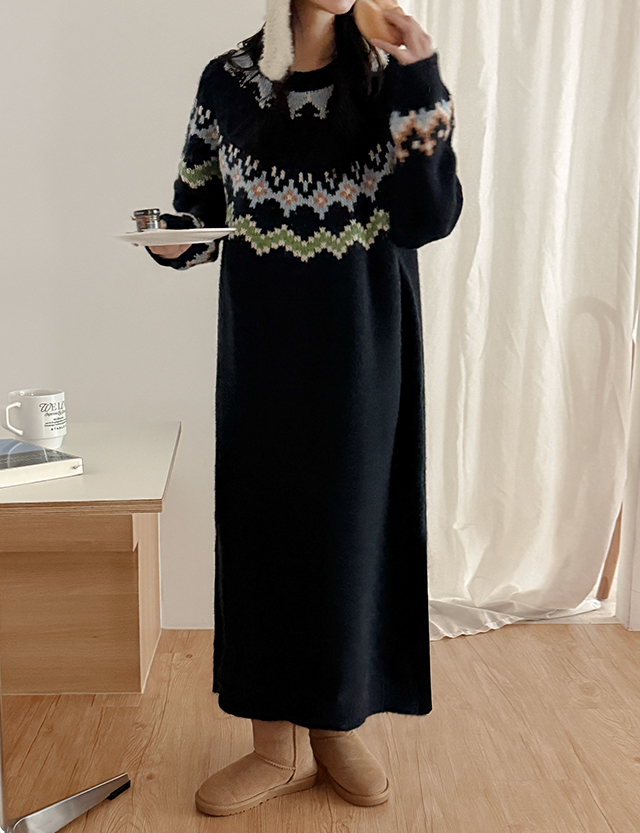 두엔 圓領 北歐 圖案 針織 長款 洋裝 85717