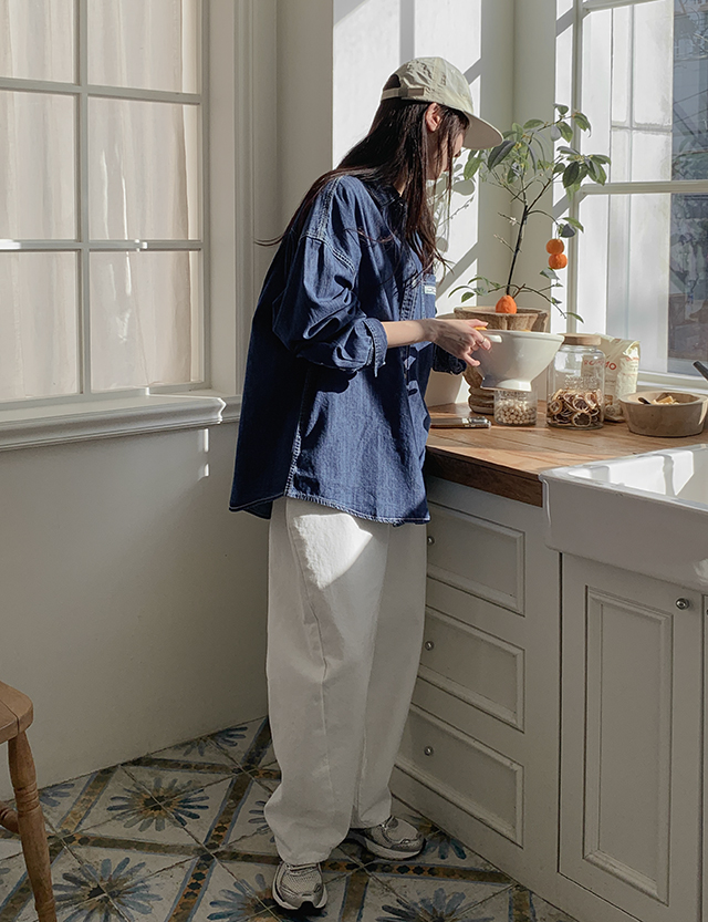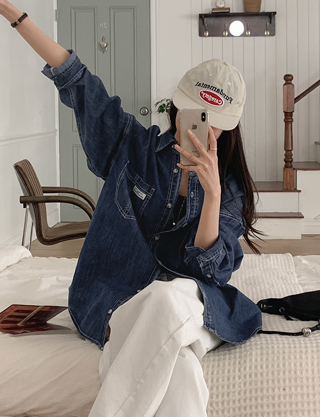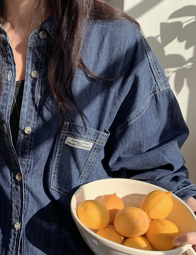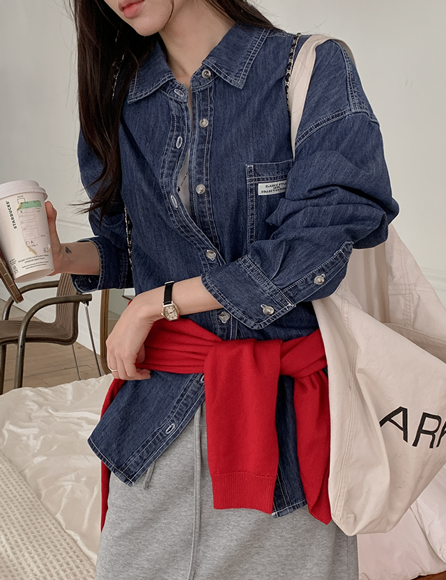 格子 寬鬆 標籤 포켓 牛仔 襯衫 86396
