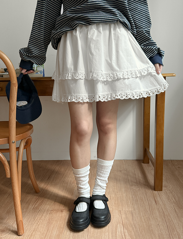 비긴 荷葉裙 褶皺 蕾絲 鬆緊腰 裙 86602
