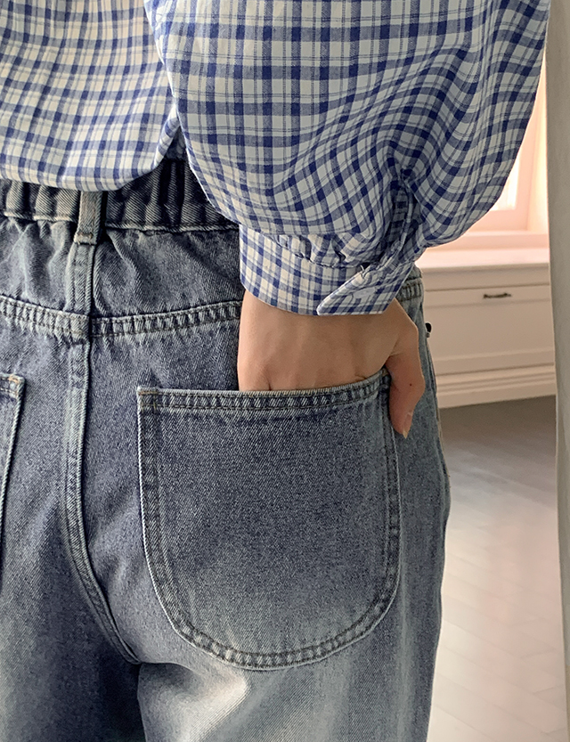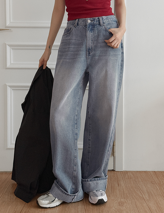 블레인 鬆緊腰 捲邊 셀비지 寬 牛仔 褲 86633