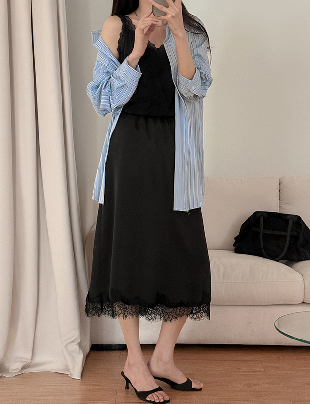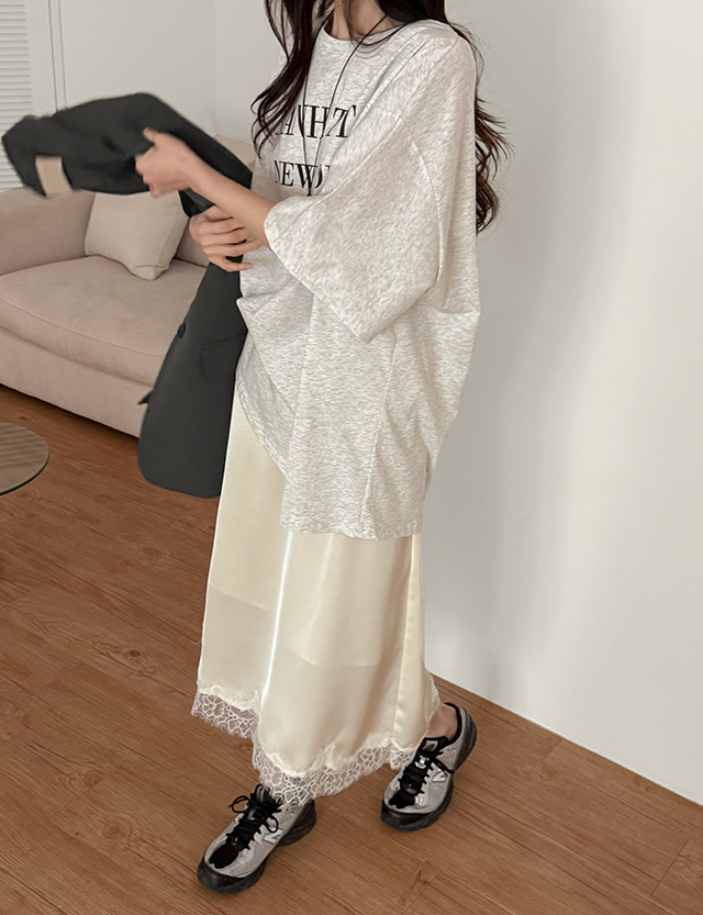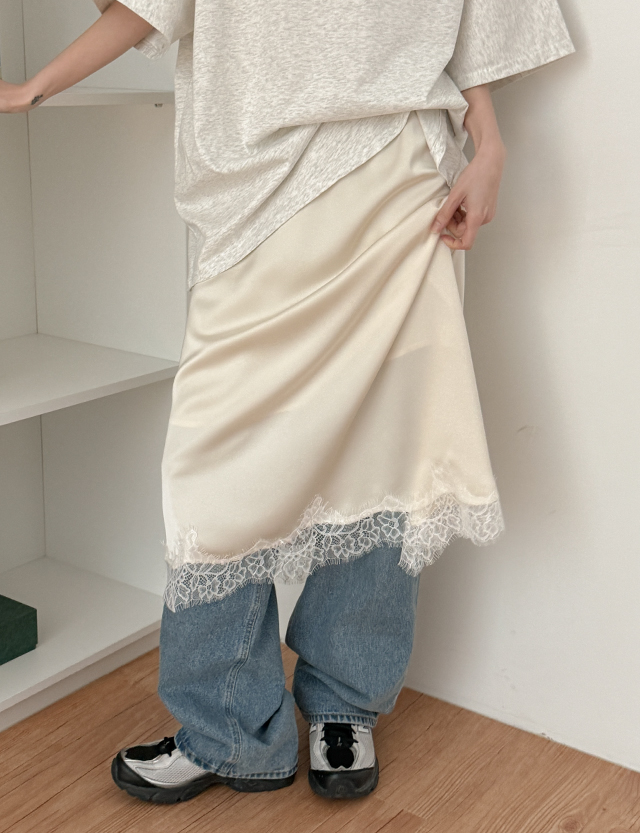 글리즈 鬆緊腰 蕾絲 緞面 미디 裙 87296